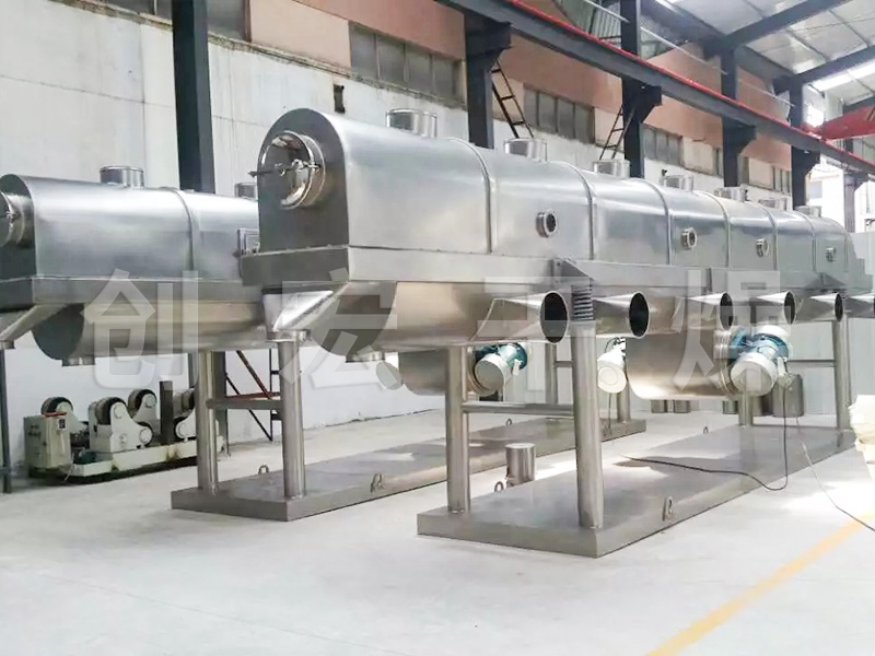 物料自然料口进入机内,在振动力作用下,物料沿水平方向抛掷向前连续运动,热风向上穿过流化床同湿物料换热后,湿空气经旋风分离器除尘后由排风口排出,干燥物料由排料口排出。